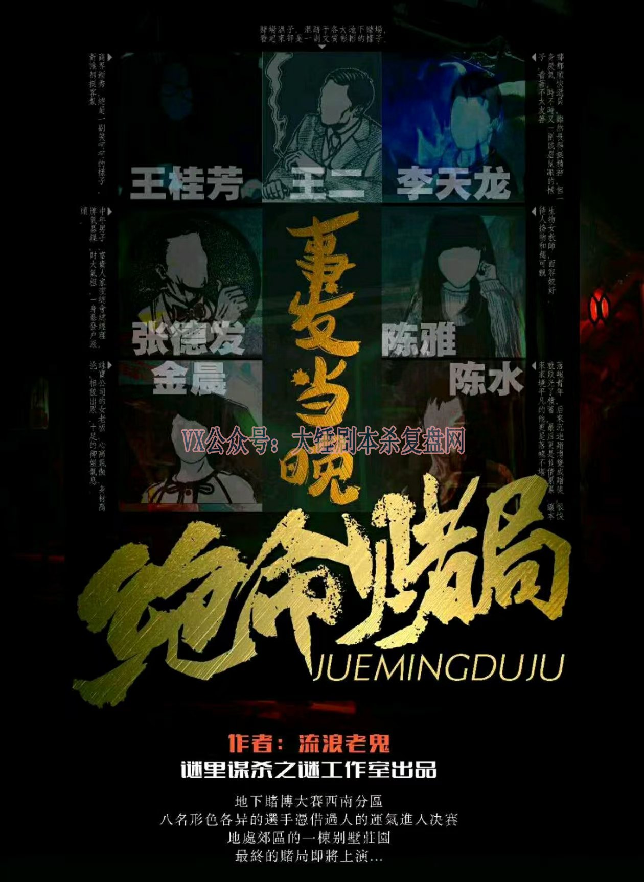 地下赌博大赛西南分区,八名形色各异的选手通过层次预 赛进入了最终的决赛赌局,原本预计两天的赌局在第二天 中午正准备继续进行的时候,有一名选手迟迟没有出现, 最终发现死在了自己的房间之内,竟然在决赛的赌局发生 了死人事件,地下联合赌场得知后很快发来指令:1、凶 手必然在你们之中,查不出凶手,谁也别想活着离开这 里;2、既然我们在进行一场赌局,那不如顺势在赌一